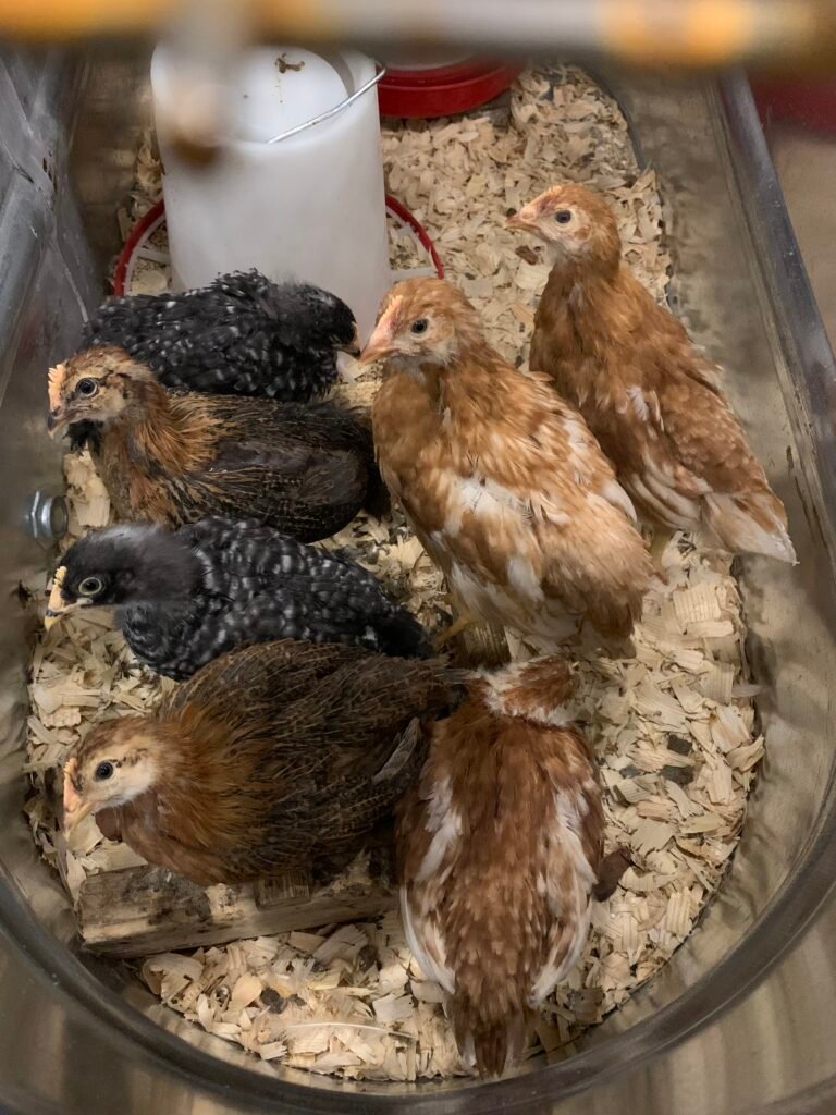 Have some perch bars of different heights for the chicks to strengthen their feet on. As they grow, they’ll get better at jumping up higher. Also, give them some enriching things to do like a cabbage-tetherball and a small kiddie-pool filled with peat moss for dustbathing.