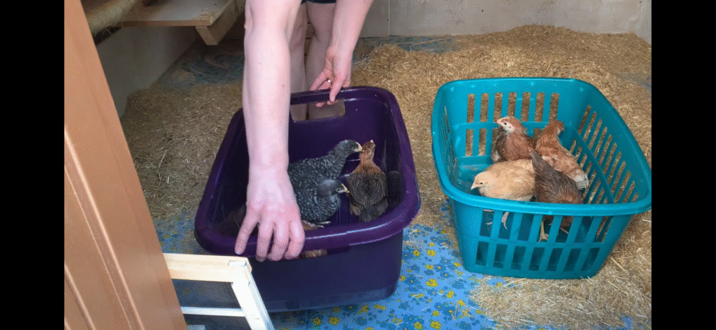 It was a bittersweet excitement for me to move our first chicks out to their new home. I was going to miss having them inside with me. I was working remotely from home, and it was so nice to turn around and cuddle a chick periodically throughout the day. I enjoyed watching them take little naps and then perk right back up again. But the other part of me was excited to see them grow into their next phase of life…. being a chicken!